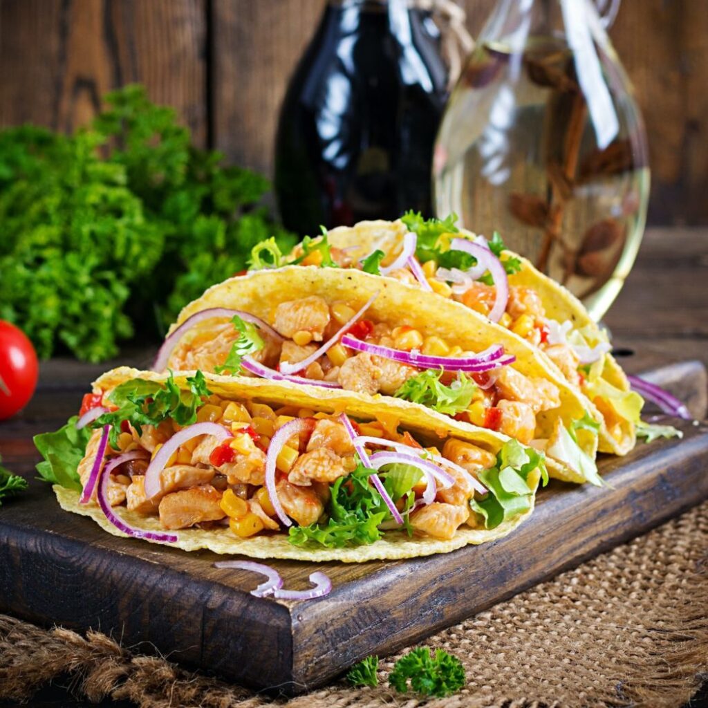 Enjoy the perfect blend of spices and tender chicken in our Chicken Tacos, topped with your choice of fresh ingredients for added flavor.