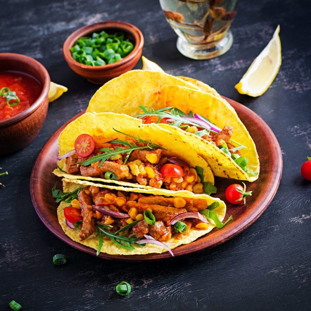 Get a taste of Mexico with our Beef Tacos, filled with seasoned beef, fresh vegetables, and finished with a drizzle of our special sauce.